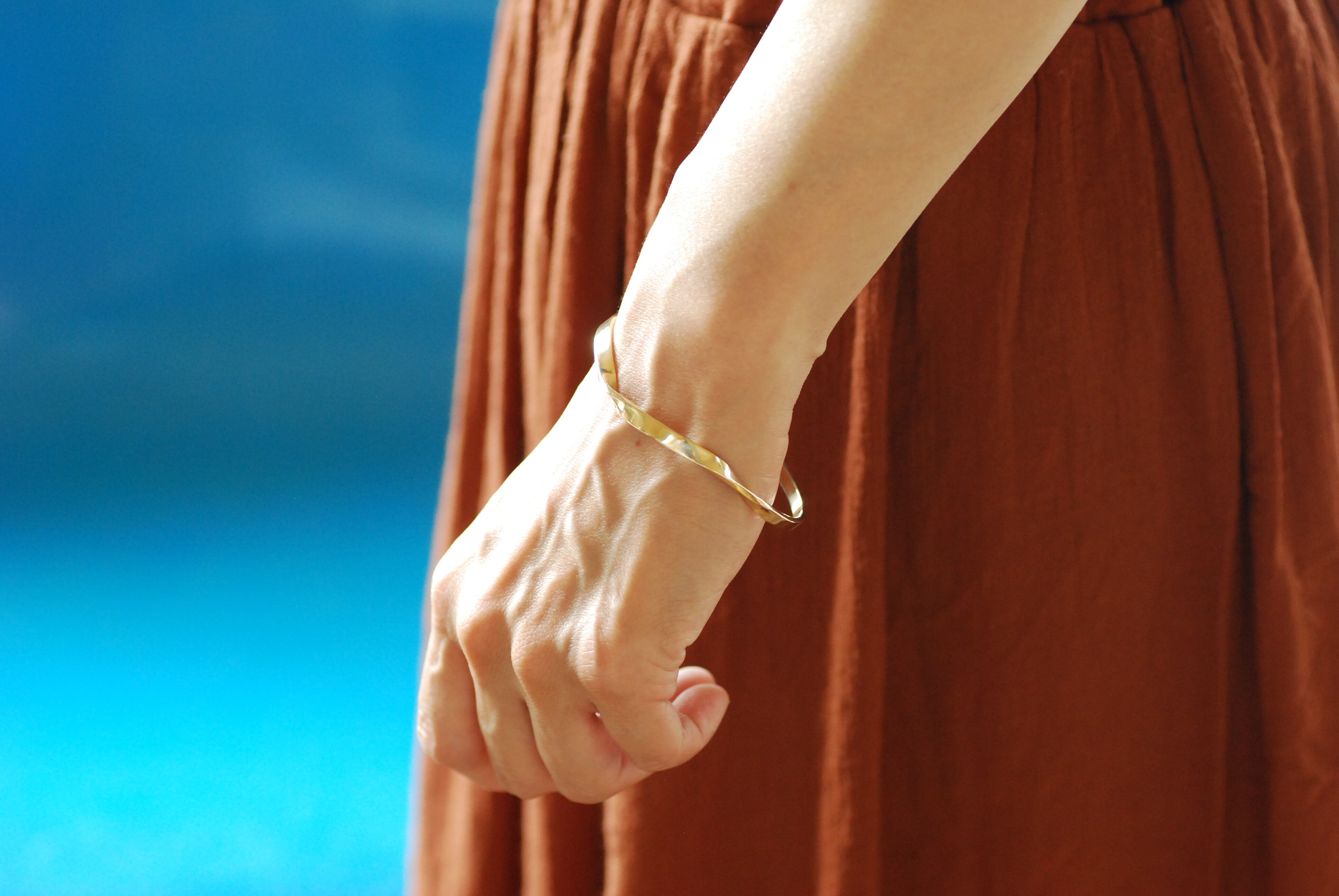 ゆるくウェーブした真鍮のバングルですよ♪バングルはこの季節につけて頂きたいアクセサリーです!すこし遊び心があって楽しく着けれるバングルです!真鍮の板をそれぞれのアクセサリーに合わせて厚さを加工して製作しています。6枚目の画像でサイズを確認してください。(1マス10mm)